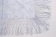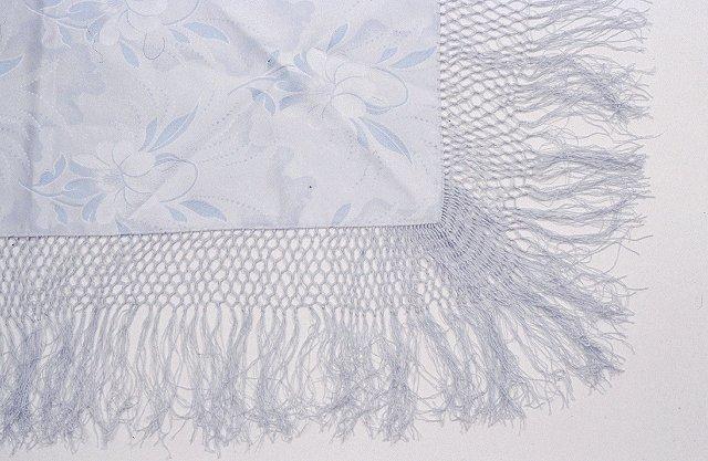 Käyttämätön. Ostetusta vaaleansinisestä tekokuitukankaasta ommeltu huivi. Reunoja kiertää 18 cm leveät, meleeratusta puuvilla- tai sekoitelangasta käsin solmitut fransut.