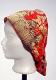 Punaisesta ja kullanvärisestä ostokankaasta ommeltu leskenlakin mallinen päähine. Etureuna koristeltu päälleommellulla kankaalla, niskakappale koristeltu erilaisin helmin, napein ja paljetein.