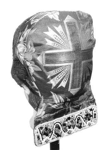| huomiot | Osan tekniikka: käsityö/tekstiili; Osan mitat: korkeus, suurin 14.00 cm; pituus 28.50 cm; Osan materiaali: kangas; Osa: etukappale; päälli- ja niskakappale |