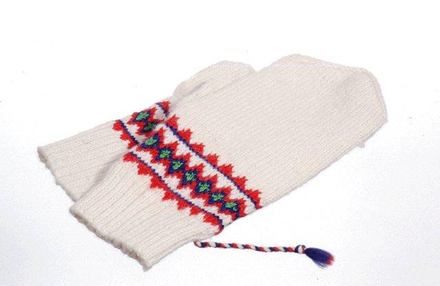Valkeaa villalankaa, ranteiden kohdalla puna-sini-vihreää kirjoneuletta. Kuvioneuleen langanpäistä solmittu n. 12 cm pitkät nyörit. Varustettu Sami Duodji -tuotemerkillä. Käyttämättömät.