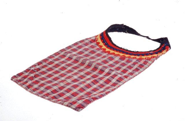 Ruudullista kuosiin kudottua puna-musta-valkoista puuvillakangasta. Vuoritettu karkealla palttinakankaalla. Sivusauma on osittain jätetty ompelematta, joten kappale on taskumainen. Pääntietä reunustaa punainen karkea verkakaitale (n. 3 cm), joka niskan takana jatkuu mustana. Päihin on ompelemalla kiinnitetty hakanen. Punaisen kankaan päälle on applikoitu tummansininen ja keltainen alareunastaan sahalaitainen verkakoriste, joista keltainen on hiukan kookkaampi.. Pääntie on koristekaitaleen kohdalta reunustettu mustalla vinonauhalla. Pääntien koristelutapa on saamelainen.