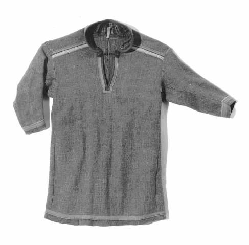 Harmaata sarkaa, koristeltu punakeltaisin nauhoin. Kaulahalkio suljetaan messinkisillä hakasilla.