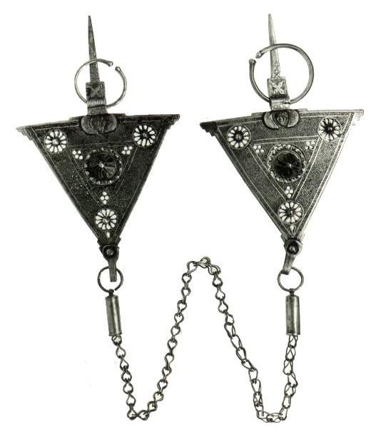| huomiot | Osan mitat: pituus 51.00 cm; korkeus 20.00 cm; leveys 12.00 cm; Kirjallisuus: Untracht, Oppi. 1982. Jewelry Concepts and Technology. Robert Hale, London, p. 134-135.; Fisher, Angela. 1987. Africa Adorned. Collins Harvill, London, p. 250-251, 253.; Osa: ketju; ketjunkannattajat; Kontekstikuvaus: Shluhnaiset kiinnittävät soljilla vaatteensa (lizar). Esine on peräisin shluheilta.; Myös arabinaiset käyttävät samanlaisia solkia (arab. l-khållalats, Marrakeshissa l-kutsfiats).; Aineistotyyppi: esine |