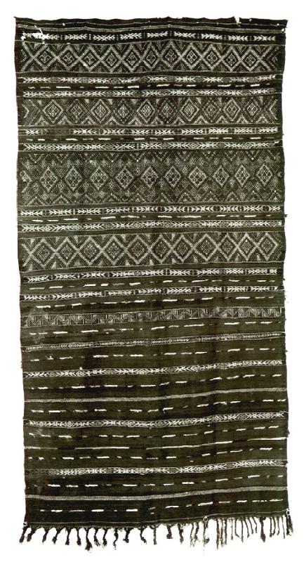 Tummanruskeaan puuvillaloimeen kudottu kuderipsisidoksinen peite (arab. l-handira), jonka ylä- ja alapää ovat erilaiset. Alapään punaruskealla pohjalla on harvoja lisäkuteella pujotettuja sinipohjaisia valko-, kelta-, ja oranssikuvioisia raitoja, muutamia ripsiraitoja sekä monivärisiä nukkaraitoja, joiden solmunpohjat näkyvät oikealla väriraitoina ja nukat ovat nurjalla puolella. Yläpäässä on hyvin leveitä lisäkuteella pujotettuja geometrisaiheisia, mm. vinoneliöin koristettuja, raitoja sekä nukkaraitoja, joiden solmunpohjat näkyvät oikealla väriraitoina, koska nukat ovat nurjalla puolella. Pohjaväri on sama punaruskea kuin alapäässäkin, samoin kuviovärit, joissa esiintyy lisäksi tumma aniliininpunainen. Toisessa päässä loimilangoista on muodostettu palmikkohapsut, toisessa loimilangat on päätelty sinisen lisälangan avulla palmikoiden. Hapsupäässä on myös metallisia renkaita. Tekstiilin kuvioiden, kuten silmiä symboloivien vinoneliöiden, on uskottu torjuvan pahaa silmää.