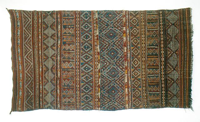 Harmaaseen luonnonväriseen villaloimeen kudottu kuderipsisidoksinen peite (arab. l-handira), joka on kauttaaltaan kuderaitainen. Pohjaväri on alapäässä suklaanruskea, yläpäässä punaisemman ruskea. Lisäkuteella pujottaen aikaansaadut moniväriset leveät kuvioraidat ovat geometrisaiheisia (neliön eri muunnelmia). Leveän pääkuvioraidan molemmin puolin on nukkaraidat, jotka on solmittu tummanpunaisella ja keltaisella villalangalla ja luonnonvalkoisella puuvillalangalla. Alapäässä on lyhyet loimihapsut, yläpäässä loimilangat on päätelty punaisen lisälangan avulla palmikoimalla. Tekstiilin kuvioiden, kuten silmää symboloivien vinoneliöiden, on uskottu suojaavan pahalta silmältä.