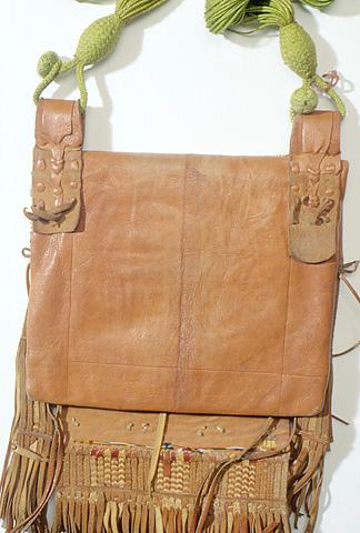 Ruskeasta nahasta ommeltu suorakulmainen litteä laukku, jonka ylin osa taipuu eteen läpäksi. Etupuolelle on ommeltu tasku, jonka läpän alaosa muodostaa laukun keskimmäisen koristekentän. Alareunassa on erillinen koristeläppä. Laukun etupuoli on koristeltu erivärisillä (vihreä, punainen, valkoinen) nahoilla applikoiduin, kirjotuin ja läpileikatuin kuvioin, mm. kahdeksansakaraisin tähdin ja holvikaariaihein. Koristekenttien ja ylimpien kuvioiden reunoja ympäröivät moniväriset puuvillahapsut. Alareunassa - samoin kuin ylhäällä sivuilla - on pitkät punotuista nahkanauhoista, hapsuista ja tupsuista muodostuvat kappaleet. Taakse laukun yläosaan on ommeltu nahkalenkit kantohihnaa varten. Erillisenä hankittu kantohihna on kirkkaanvihreä puuvillalankavyyhti.