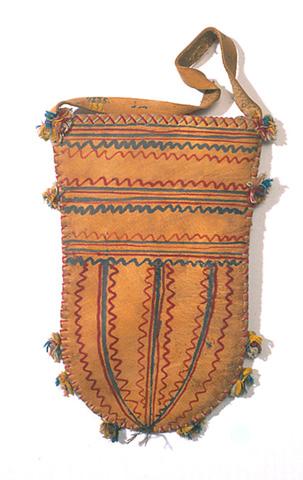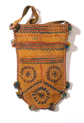 Ruskeasta nahasta ommeltu pussimainen kukkaro, jossa on lyhyt kantohihna. Molemmille puolille on maalattu mustalla ja punaisella suoria linjoja, aaltoviivoja ja toiselle puolelle kolme kahdeksansakaraista ristiä (kaksinkertainen viitoskoriste). Saumoissa on pieniä puuvillalankatupsuja. Viitoskoristeen on uskottu tuovan onnea ja suojaavan esinettä ja sen sisältöä pahalta silmältä.