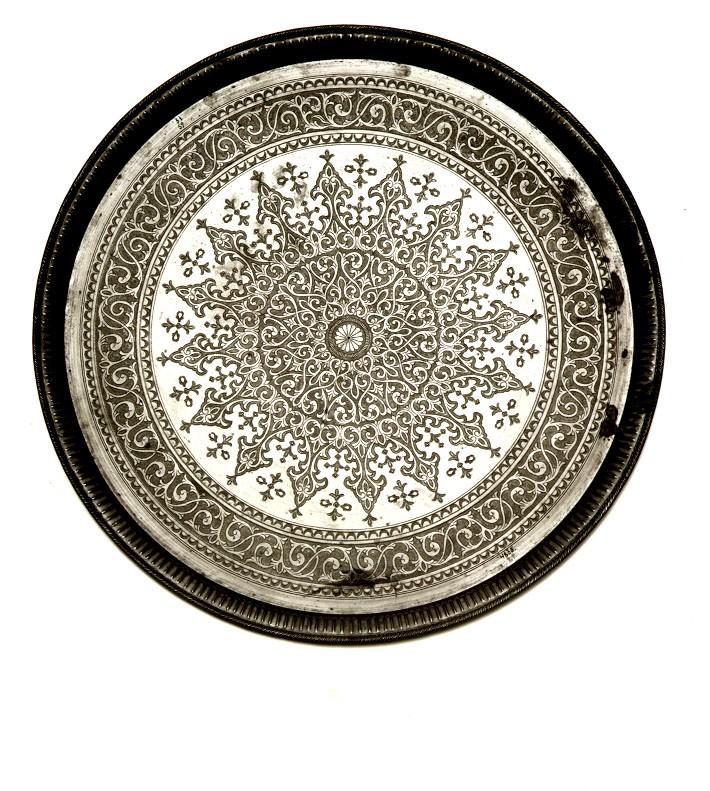 Messinkinen tasapohjainen tarjotin (arab. s-sinia tai t-tåbla), jossa on matalat viistosti kohoavat reunat. Sisäpuolen pohja on koristeltu kaiverretuin kasviornamenttikuvioin. Keskuksen pientä 16-terälehtistä kukkaa ympäröi kaksi 16-sakaraista tähteä, ja uloinna pohjan reunaa kiertää lehtiornamenttikehä. 16-sakarainen tähti ja 16-terälehtinen kukka ovat moninkertaisia viitoskuvioita (keskusta ja sitä ympäröivät neljän ryhmät), joiden on uskottu suojaavan pahalta silmältä. Pinta on osin patinoitunut.