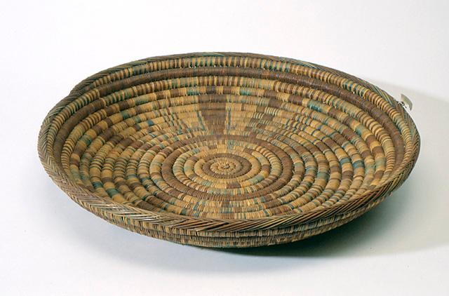 Kasvinjuurista nauhatekniikalla punottu laakea vatimainen tarjotin (berb. isuggi, diminut. tisuggit). Tummanruskeilla kuiduilla on astiaan punottu selviä keskustasta reunoille suuntautuvia säteitä. Kuvioinnissa on myös käytetty vihreitä kuituja. Pinta on osin tummunut.