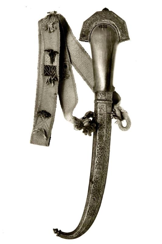 | huomiot | Osan mitat: pituus 71.00 cm; Käyttäjä: Tikaria käyttivät varakkaat arabit.; Osa: hihnoineen; Kontekstiaika: 1800-luvun loppu, 1900-luvun alku; Aineistotyyppi: esine |