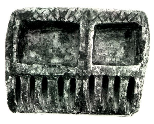 Vihertävänharmaasta kivestä karkeasti veistetty litteä suorakulmainen öljylamppu. Toiselle laidalle on hakattu öljysäiliöt, toinen suorakulmainen ja toinen neliön muotoinen. Toisella laidalla ovat urat (9kpl) lampun sydämiä varten. Aivan reunaan säiliöiden viereen on kaiverrettu rivi rasteja. Pinta on paikoin tummunut.