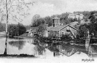 | postikortti: Myllykylän tehdasyhteisön rakennuksia, mäellä Myllykylän hovi |