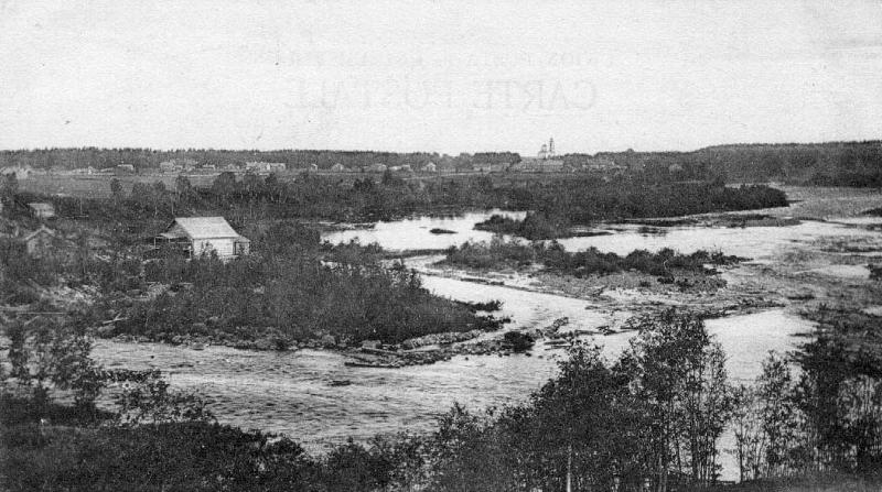 | postikortti: Tulemajoki, taustalla kirkonkylä |