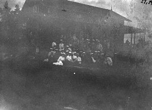 | valokuva: osakuntalaisia matkustajakodin edessä, kesäjuhlat |