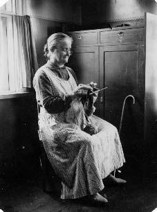 | valokuva: emäntä Edla Soikkeli kutoo sukkaa |