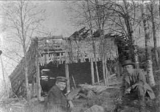 | valokuva: maisteri P. Supinen ja edustaja J. Martikainen vanhan vajan edessä "agitatsionimatkalla" |