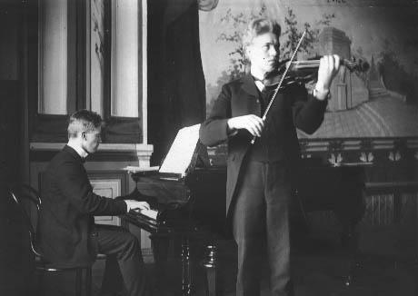 Väinö Mäkinen soittaa pianoa, Heikki Halonen viulua.