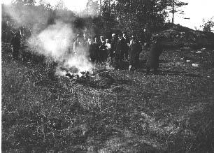 | valokuva: Sortavalan lyseolaisia "potattiretkellä", kiviä kuumennetaan perunakuoppaan |