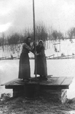 | valokuva: naiset nostavat kaivosta vettä korentoon |