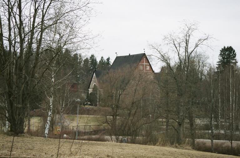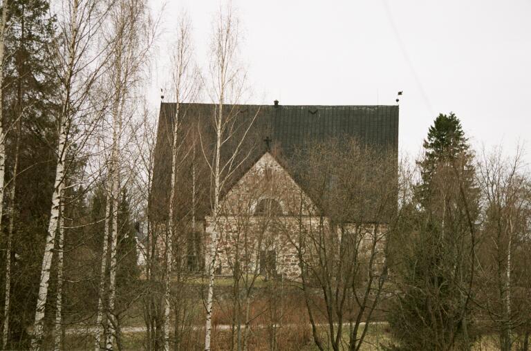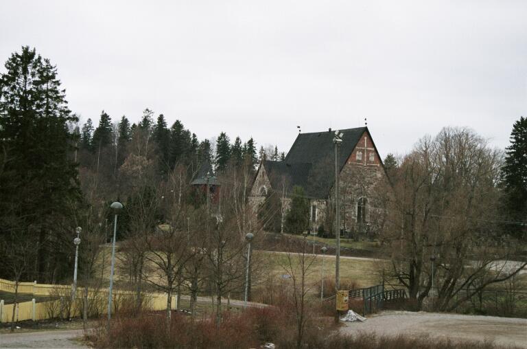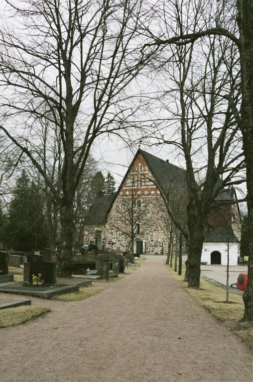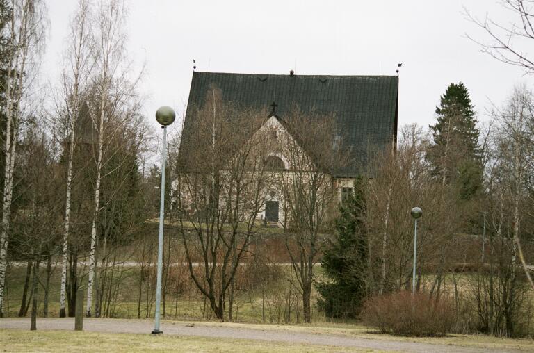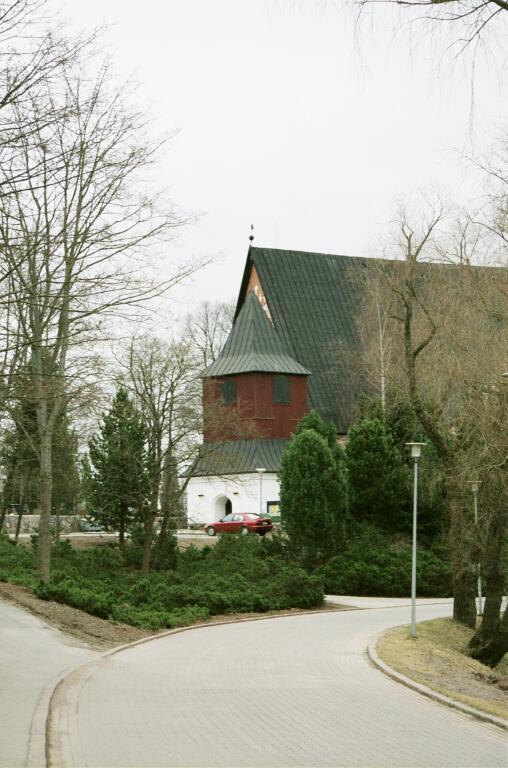 Keskiaikainen harmaakivikirkko on Espoon vanhin ja arvokkain rakennusmuistomerkki. Kirkon rakennuspaikaksi on valittu matalahko kumpare Espoonjoen varrella entisen Kirkkojärven rannalla. Paikan valintaan lienevät vaikuttaneet ennen kaikkea liikenteelliset tekijät. Vielä keskiajalla Espoonjoki oli todennäköisesti käytetty venereitti Espoon keskiosiin. Suurempi merkitys oli kuitenkin Suomen silloisella valtaväylällä, Turun ja Viipurin hallintokeskuksia yhdistävällä ns. Kuninkaantiellä. Tien talvinen linjaus seurasi Espoonjokilaaksoa ja kulki aivan kirkon ohitse. Sen sijaan varsinainen Kuninkaantie ohitti kirkon noin kilometrin pohjoisempaa. Morbyn ja Lövkullan välillä oli päätiestä haarautuva kirkon kautta kulkeva lenkki. Espoon kirkossa voidaan erottaa kolme päärakennusvaihetta, jotka viimeinen v. 1982 valmistunut restaurointi entistä kiinteämmin yhdistää toisiinsa. Kirkon vanhimmat osat on tavallisesti ajoitettu 1400-luvun jälkipuoliskolle. Ensimmäinen historiallisissa lähteissä mainittu Espoon kirkkoherra Henrik Olavinpoika astui virkaansa 1558, ja kirkon on oletettu valmistuneen samoihin aikoihin. Viimeisen restauroinnin yhteydessä tehdyt perusteellisesti rakennushistorialliset tutkimukset ja mm. rahalöydöt tuntuvat viittaavan siihen, että kirkon rakentaminen olisi aloitettu jo 1300- ja 1400-lukujen vaihteessa. Myöhäiskeskiaikaisessa asussaan kirkko oli tyypillinen harmaakivikirkko, jossa oli suorakaiteenmuotoinen runkohuone, asehuone etelässä ja sakaristo pohjoisessa. Tiilisten päätykolmioiden koristelu liittää kirkon ns. itäuusmaalaiseen kirkkotyyppiin. Länsipäädyn tiilikoristelun pääaiheena on kookas latinalainen risti, jonka päissä on pienet poikkisakarat. Ristiä ympäröivät erimuotoiset komerot, harmaakiviosan rajalla on kulmatiilinauha. Kirkon itäpäädyn koristelu on yksinkertaisempaa, mutta aiheet ovat samoja. Kirkko on kolmilaivainen. Leveämmässä keskilaivassa on tähtiholvit ja kapeammissa sivulaivoissa ristiholvit. Keskiaikaisesta kivikirkosta on Espoossa säilynyt noin puolet, itäinen ja läntinen neljännes. Oviaukoista on pääpiirteissään alkuperäisessä asussaan säilynyt vain läntinen portaali. Myös länsi- ja itäpäätyjen ikkunat ovat edelleen säilyneet lähes alkuperäisinä. Kirkossa oli paanukatto vuoteen 1859, sen jälkeen luiskekivikatto vuoteen 1885 (vrt. kohde 96) ja siitä eteenpäin peltikatto. Ahtaaksi käynyttä kirkkoa ryhdyttiin 1821 laajentamaan ristikirkoksi Helsingin Kaupunginarkkitehti Pehr Granstedtin suunnitelmien mukaan. Eteläinen harmaakivinen ristisakara valmistui jo samana vuonna. Seuraavana vuonna aloitettu pohjoinen ristisakara tehtiin noin neljä metriä pidemmäksi, joten kirkosta tuli lievästi epäsymmetrinen. Keskiaikaisen kirkon keskimmäinen pilariperi holveineen purettiin ja tilalle rakennettiin tynnyriholvi. Uusien ristisakaroiden harmaakivimuuraus muistuttaa keskiaikaista rakennustapaa, mutta uusien osien arkkitehtuuri on selvästi empirevaikutteista. Kirkon restaurointi aloitettiin 1929. Aloitteen tekijänä oli Espoonkartanon omistaja, todellinen valtioneuvos August Ramsay. Restauroinnin päälinjat suunnitteli arkkitehti professori Armas Lindgren, joskin hän kuoli ennen töiden valmistumista. Armas Lindgren pyrki yhdistämään kirkon kaksi päärakennusvaihetta paremmin toisiinsa valamalla keskitilan ylle suuren betonikupolin. Myöhäiskeskiaikaiset, 1791 peitetyt rikkaat seinä- ja holvimaalaukset paljastettiin uudelleen. Myös uudet penkit, alttari, saarnastuoli ja lehteri rakennettiin kirkkoon 1931 valmistuneen restauroinnin yhteydessä. Espoon kirkon toinen restaurointi valmistui jouluksi 1982. Arkkitehtiprofessori Ola Hanssonin suunnittelema työ toteutti joltain osin edelleen Armas Lindgrenin jo 1930-luvulla suunnittelemia, mutta toteuttamatta jääneitä restaurointitavoitteita. Näihin kuului mm. alttarin siirto kirkon keskiosaan. Pohjois-Saksassa 1400-luvulla tehty krusifiksi palautettiin kirkkoon. Myös kirkon lämmitys- ja valaistusjärjestelmä uusittiin ja uusi tiililattia rakennettiin. Harmaakivikirkon luoteispuolella oli 1600-luvun lopulta 1800-luvun alkuun vaatimaton puukirkko suomenkielisiä seurakuntalaisia varten. Kirkko ja hautausmaata ympäröivä kivimuuri on vanhimmilta osiltaan rakennettu ainakin jo 1700-luvulla. Espoon nykyinen kellotapuli valmistui 1767 rakennusmestari J.C. Hillertin rakentamana. Sen on mahdollisesti suunnitellut arkkitehti Samuel Berner 1758. Tapulin alaosa on harmaakiveä ja puinen yläosa on jonkinverran muuttunut alkuperäisestä. Kirkon pohjoispuolella oleva, 1827 rakennettu tiilinen, ruumishuone on muutettu siunauskappeliksi.
