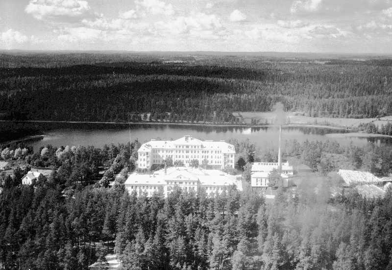 Kuvassa vuonna 1927 perustettu Moision mielisairaala kuvattuna idästä. Sairaalan takana näkyy Moisionlampi, jonka takana kulkee nykyisin valtatie 13 Mikkelistä Lappeenrantaan.