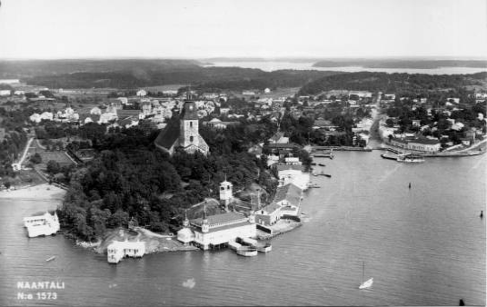 | ilmavalokuva: Naantali, etualalla kirkko |