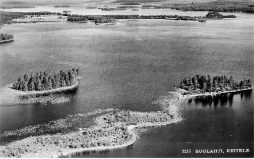 Voin laittaa sähköpostina loivemmasta kulmasta tehdyn ilmakuvan Keiteleen Kovalanniemestä suurella pilvitaivasosuudella -samalla numerolla ja nimekkeellä toisenlainen kortti kaikin takapainatuksin. Tämän toisen kuvan alareunassa näkyy nämä kaksi pientä saarta, jotka tässä ovat ikäänkuin etualalla, kun kuvauskulma jyrkempi. Ikävä kyllä korttia ei ole postitettu. Voisivat muuten olla luettelossa peräkkäin Suolahti-kortti N:0 3216 kanssa- laitan siitäkin kuvan tarvittaessa.