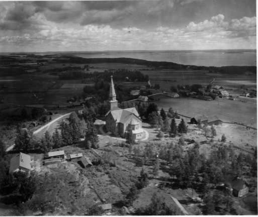| ilmavalokuva: Asikkala, kirkko, kylätie, asutusta, peltoaukeita |