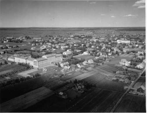 | ilmavalokuva: Näkymä Seinäjoen kauppalasta, omakotiasutusta, vasemmalla suuri rakennus (koulu, sairaala, teollisuuslaitos???) |