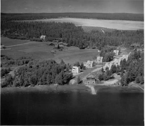 | ilmavalokuva: Kuorevesi, Hallinrannan asuntoalue, rannassa sauna-pyykkitupa ja laituri, vasemmalla Järvensivu, taustalla lentokenttä |