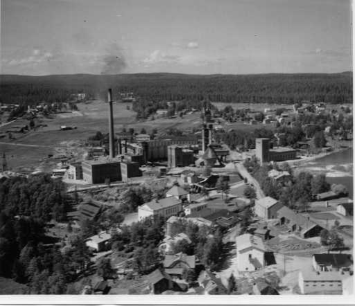 | ilmavalokuva: Jämsänkoski, Yhtyneet Paperitehtaat Oy, näkymä tehdasalueelta, omakotiasutusta |