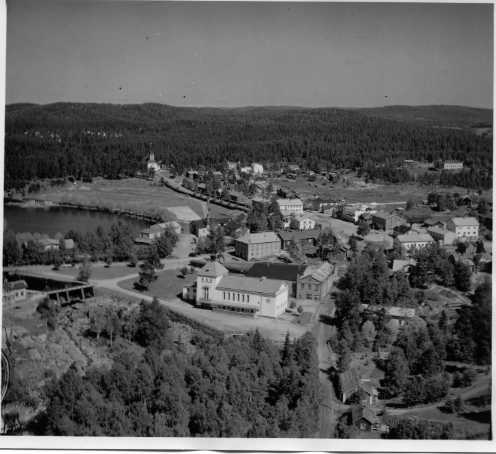 | ilmavalokuva: Jämsänkoski, näkymä Ilveslinnan kohdilta, asuin- ja liikerakennuksia, rautatie, taustalla kirkko |