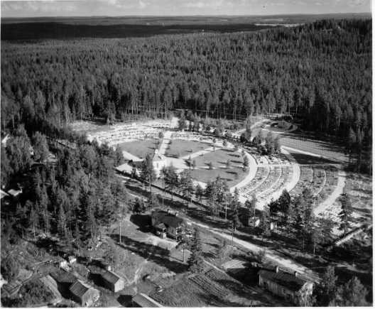 | ilmavalokuva: Mänttä, sankarihautausmaa, siunauskappeli , ympärillä mäntymetsää, etualalla pari asuinrakennusta |