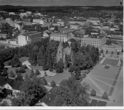 | ilmavalokuva: Jyväskylä, näkymä kaupunkiseurakunnan kirkon tienoilta Kauppakadun, Taulumäen, Halssilan suuntaan |