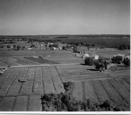 | ilmavalokuva: Kyyjärvi, peltoja, asuinrakennuksia ulkorakennuksineen, järvi |