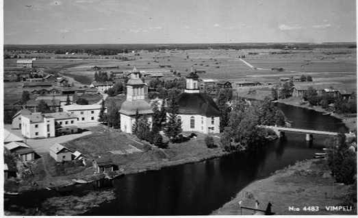 | ilmavalokuva: Vimpeli, kirkko Savonjoen rannalla, ympäröivää asutusta, taustalla laajat peltoaukeat, latoja |