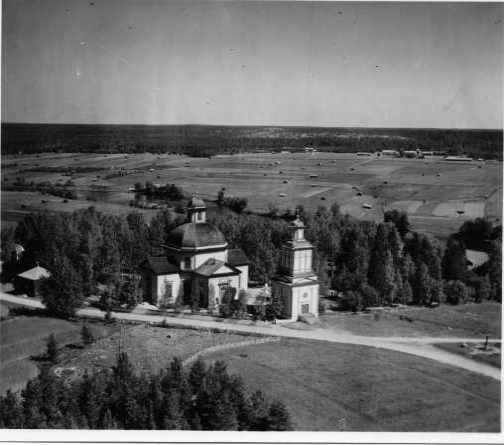 | ilmavalokuva: Veteli, kirkko, joki, pellot, ladot |