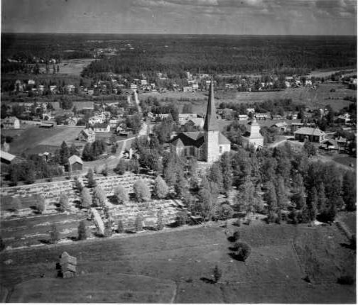 | ilmavalokuva: Pietarsaaren maalaiskunta, kivikirkko, jonka runkohuone ja länsitorni ovat 1400-luvulta, laajennettiin ristikirkoksi 1787-95 Jacob Rijfin johdolla |