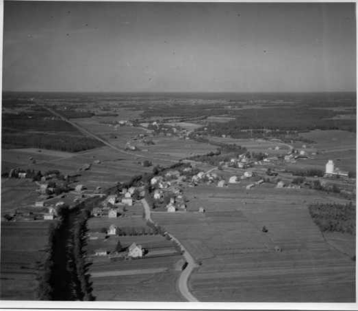 | ilmavalokuva: Pietarsaaren maalaiskunta, Kolppi - Kållby, asutusta nauhamaisesti joen ja teiden varsilla, peltoaukeat, rautatie |