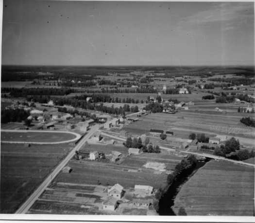 | ilmavalokuva: Kälviä, joki, peltoaukeat, asutusta, taaempana kirkko, vasemmalla urheilukenttä tai (ravi)rata |
