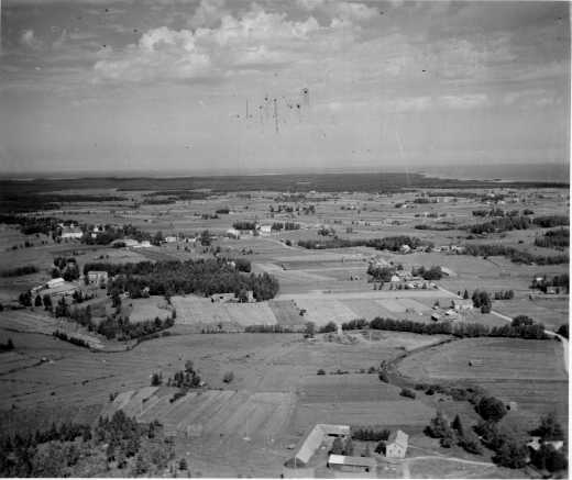 | ilmavalokuva: Lohtaja, laajat peltoaukeat, asuinrakennuksia ulkorakennuksineen, taustalla meri |