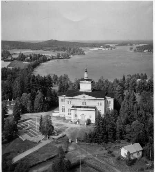 | ilmavalokuva: Rautalampi, kirkko ja sankarihautausmaa puiden keskellä Åijäveden ja Hankaveden välisellä kannaksella |