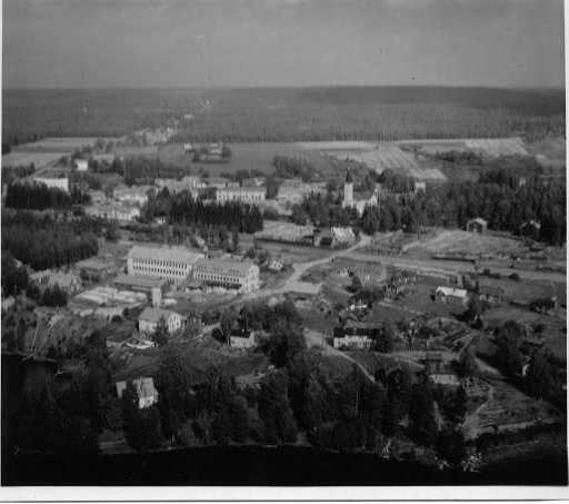 | ilmavalokuva: Suonenjoki, asuin- ja liikerakennuksia, ilmeisesti teollisuurakennus, rautatie, päätytornillinen puukirkko (1865) |