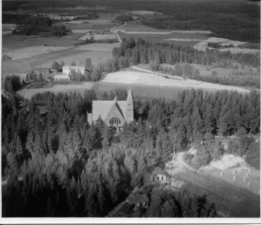 | ilmavalokuva: Muuruvesi, kirkko puiden keskellä, peltoa, pari asuinrakennusta |