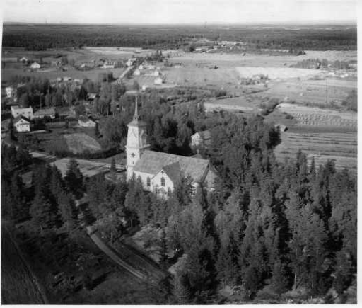 | ilmavalokuva: Polvijärvi, kirkko puiden keskellä, ilmeisesti sankarihautausmaa, peltoa, rakennuksia |