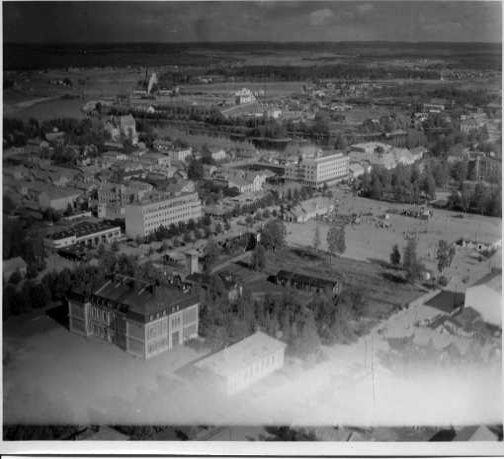 | ilmavalokuva: Joensuu, näkymä kauppatorin tienoilta, liike- ja asuinrakennuksia, kerrostaloja, Pielisjoki |