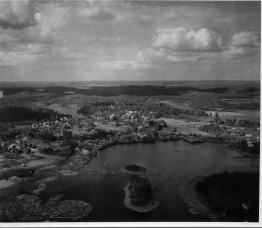 | ilmavalokuva: Savonranta, järvi, uitettua puuta, puupinoja rannassa = ilmeisesti Vuokalan saha |