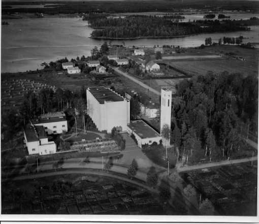 | ilmavalokuva: Varkaus, kirkko, peltoa, muutama asuinrakennus järven rannalla |