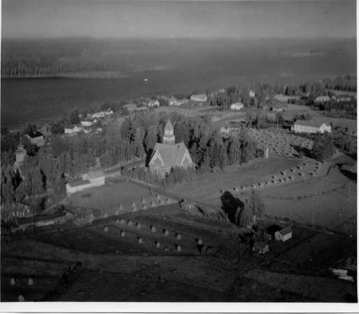 | ilmavalokuva: Hirvensalmi, kirkko, peltoja, asuinrakennuksia, järvi |