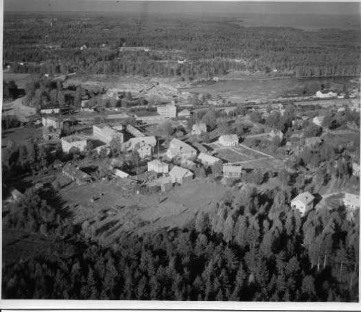 | ilmavalokuva: Mäntyharju, rakennuskeskittymä, rautatie, mahdollisesti asemarakennus, kapea vesireitti, jossa uitettavaa puuta) |